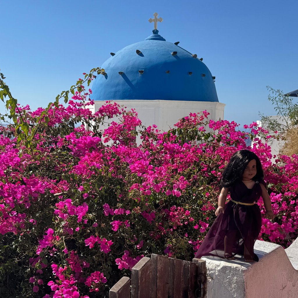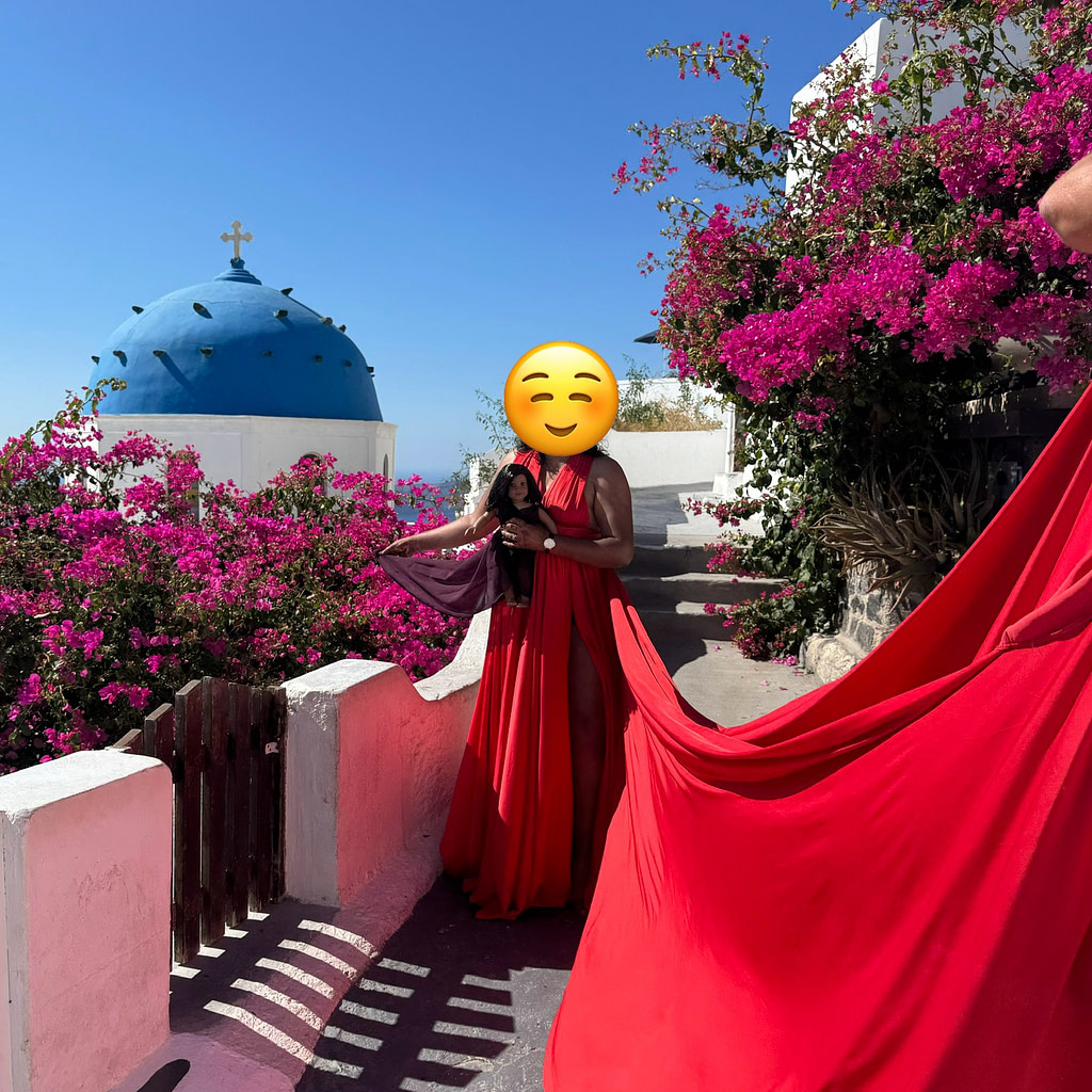 Santorini is known for photoshoots using dresses with massive trains, called “flying dresses;” which look very pretty against the landscape and architecture of the island. Rita was excited to join the photoshoot with her own purple flying dress, which was custom made by KatieSewingByFaith on Etsy. Rita hopes to re-purpose it for a dance recital some day.