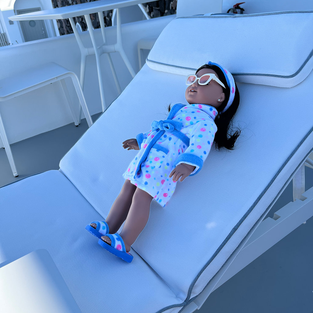 The next morning, Rita was excited to hang out by the heated pool, but didn’t realize how windy it was and belly flopped into the pool. 🙁 She decided this whole misadventure wasn’t that bad when she had to recover by sunbathing with some stunning views of the sea. A few hours later, she was as good as new!
