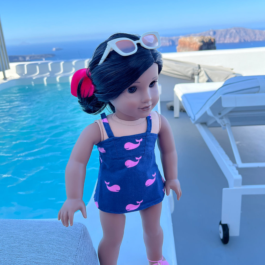 The next morning, we climbed part of Skaros Rock, which houses the remains of a castle that was built in the 13th century. We had great views of Skaros from our hotel room and so it was nice to actually explore it! After this sunrise trek, Rita decided to give lounging by the pool another try and is so glad she did! Her swimsuit and coverup outfit are made by SASstitch on Etsy.